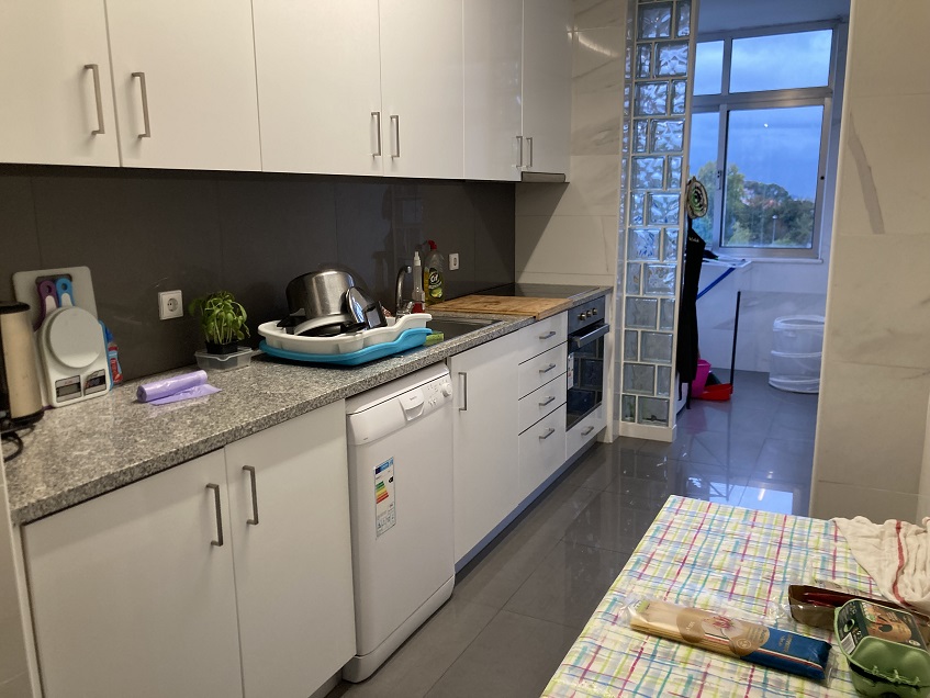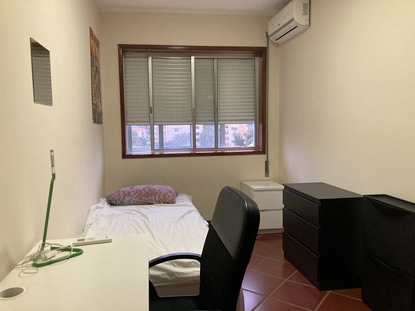 Quarto em apartamento pequeno, com sala e cozinha. Transportes e metro à porta